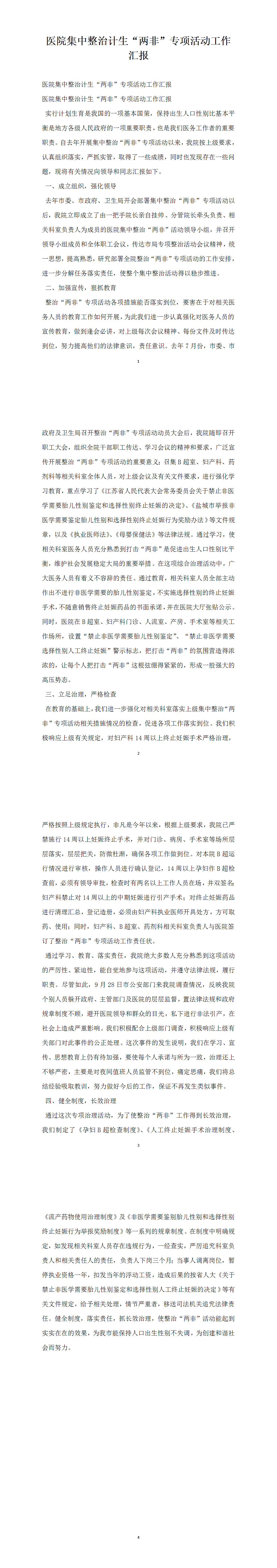 醫(yī)院集中整治計(jì)生“兩非”專項(xiàng)活動(dòng)工作匯報(bào)
