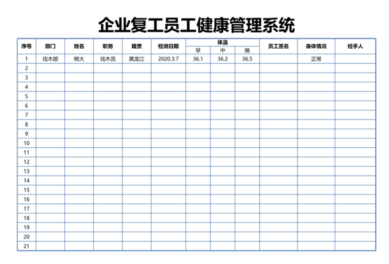 企業(yè)復(fù)工防疫門衛(wèi)出入體溫登記表